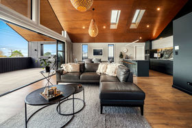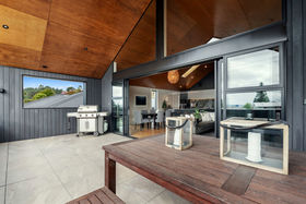 Beneath a soaring ceiling, the living area spreads out, its open plan layout ensuring an easy flow from the designer kitchen with its step-in pantry, through the dining and living spaces and out onto the large multi-weather deck where the views can be enjoyed from under the over of a roofline that has been designed for shelter and to keep the harsh sun at bay in the height of summer.